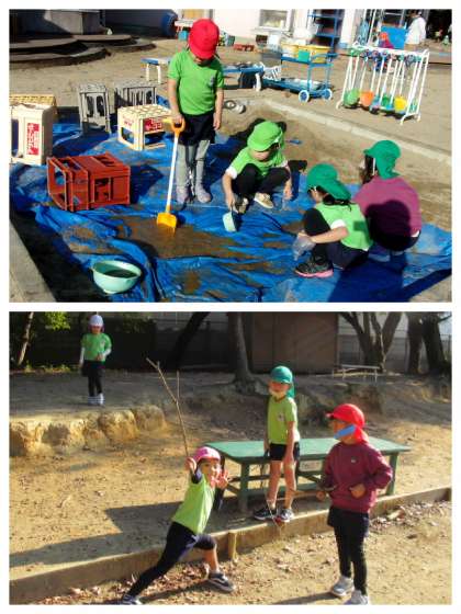 お外遊びでは、砂場で小さな小さな貝殻を見つけては集めていました。何気なく見ている砂場でも、子どもたちにとっては遊びの発見場所です。明日もまた、集めましょうね!