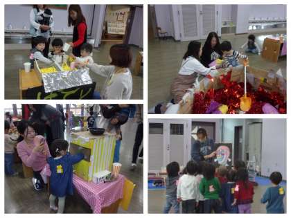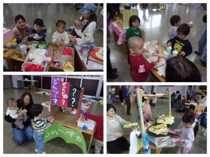 幼稚園のお兄さん・お姉さんが作ったお店屋さんの品物を貸してもらって、おうちの人や友達と一緒においしい料理を作ったり、「どうぞ」と渡したりしながらやりとりを楽しみました。