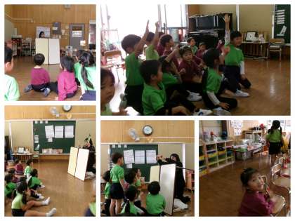 自発活動で、音のなるおもちゃを作ったり、どんぐり転がしをする中で、コロコロという音や鉄の入れ物中にカン♪と音が鳴る面白さを感じて遊んでいるみかん組さん。そこで、学級活動では、身の回りにある音を探して遊びました。