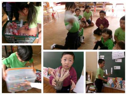 まずは、音だけ聞いて「なんのおとでしょう?」クイズをしました♪ブロックのぶつかる音や缶をたたく音など耳をよく澄ませて真剣に聞いて想像し考えていました☺お部屋の中にはまだまだ“音”がありそう!早速、音探しスタート!廃材を手でかき回す音、マグネットがつく音、ビニール袋の音などたくさん見つけました♪