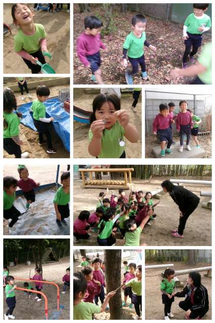 「森の中にもあるで!」「風の音とか、虫の音とか☺」というので、森にも行ってみました。物を叩く音はもちろん、砂の上や枯葉の上を歩く音、木の枝を折る音、石を落とす音などたくさんの音をみつける子ども達♪手でたたく音と枝で叩く音の違いや、木と竹の音の違いにも気づいて楽しむ子もいてました☺見つけた音で、お部屋で遊んでいるリズム打ちを友達を声を掛け合いながら楽しむ姿もみられました♪