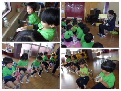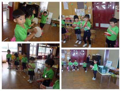 揺らしてみたり、太鼓みたいに叩いてみたり・・・・揺らした後に叩いたり・・・・音楽に合わせてさまざまな鳴らし方を考えていました。一つの楽器でも鳴らし方がたくさんあるんだね!そして鳴らし方によって聞こえ方が違うんだね!