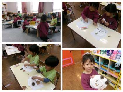 手洗い講座の後は、部屋で自然物を使ったお面づくりを楽しみました。昨日集めた葉っぱや木の枝、以前に集めた松ぼっくりやドングリを組み合わせて、「うさぎ」「くま」「ライオン」など動物に見立ててつくりました。