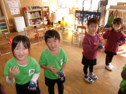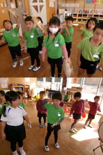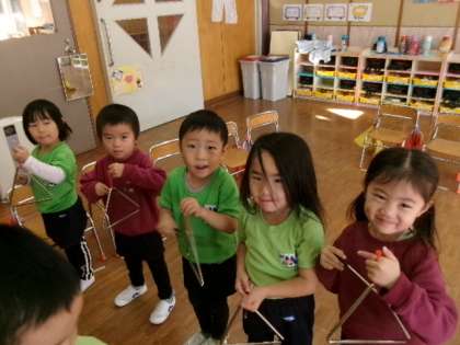 今日は楽器をもって、音遊びをしました。楽器には鳴らしやすい正しい持ち方があることを伝え、みんなで鳴らしてみました♪初めてもつトライアングルは少し難しそうでしたが、一生懸命きれいな音を鳴らしていましたよ(^^♪