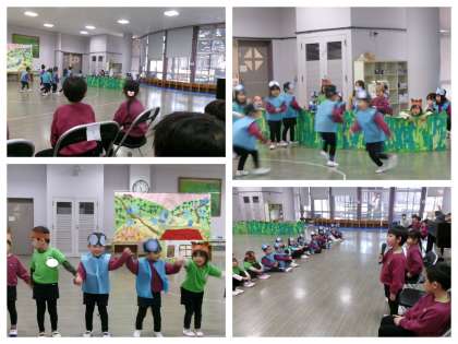 午後からはぶどう組さんの劇を見せてもらいました。大きな声で発言したり、体で表現したり!とっても上手だったね。うさぎ組さんにとっていい刺激になったことだと思います!
