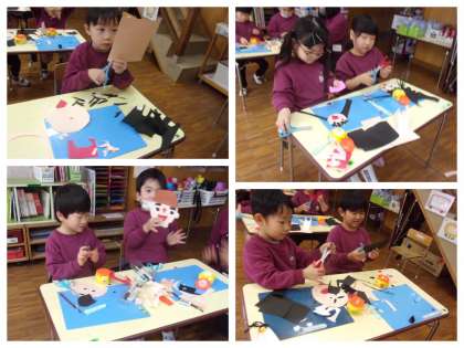 お部屋では修了式の壁面制作を始めています。「もう幼稚園終わりなんか…。」「なんか涙出そう…。」と子ども達。髪の毛や制服の色、鼻や髪型など考えながら黙々と作っていましたよ。どんな『自分』が完成するのか楽しみです(^^♪