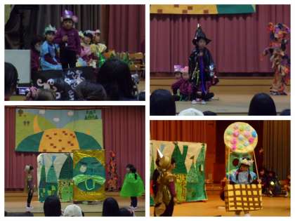登場人物も多く、1人2役する子もいましたね。一人で言うセリフも多く、またナレーションや大道具の出し入れなども子どもたちが担うのは、5歳児ならではです。たくさんのお客さんの前で緊張も見られましたが、それでも自分の役割を果たそうと一生懸命頑張る子どもたちに、1年間の成長を感じました。そっと教える姿も頼もしかったですよ。