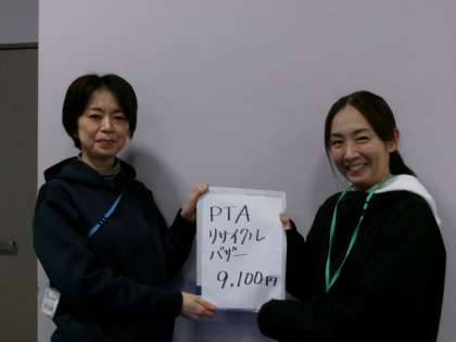 今日はPTAさんより、バザーの収益金をいただきました。子どもたちに還元できるように、使い道を検討中ですので、決定次第お知らせします。