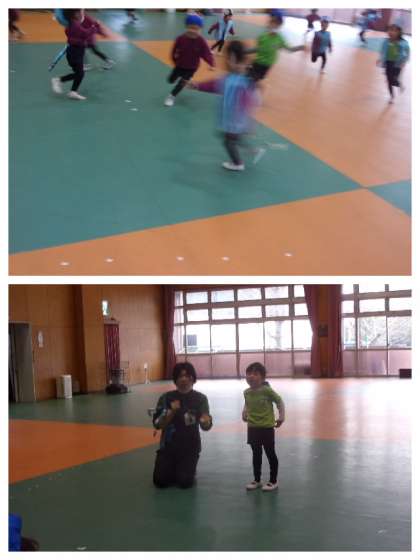 劇を見てもらった後は、ぶどう組さんが「しっぽとりのおにごっこしよう!」と誘ってくれました♪ぶどう組さんは走るのが早くてびっくりしたね!ぶどう組さんのしっぽをとりたくて必死に追いかけていたうさぎ組さん!楽しかったね!ぶどう組さんみたいに早く走れるようになりたい!と刺激を受けたことだと思います!また遊ぼうね!