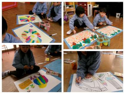 そのあとは1年間の思い出を振り返り思い思いに絵を描きました。運動会や遠足、日舞の発表会などそれぞれの印象に残っている思い出を、絵の具やクレパス、サインペン、色鉛筆など好きな画材を使って描きました。月曜日に友達と作品を紹介しあいたいと思います♪