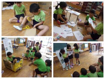 今日もゆうえんちづくりに意欲的に取り組んでいた子どもたち。乗れる汽車づくりでは、テープで張り付けていたひもが引っ張ると何度も取れるので、どうすればいいか考えました。話し合う中で、上につけるより下のほうに括り付けるほうが良いと気づき、変更すると壊れずに動かすことができていました♪