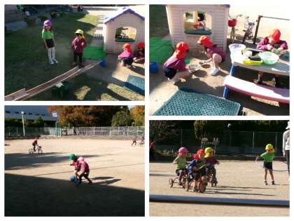 今日はぽかぽか陽気🌞 ままごとや、ドングリころがしを楽しんだり、サッカーや自転車・三輪車にのってハイキングごっこをしたりしていましたよ!「先生!今日はちょっと暑いわ(*´Д`)」とトレーナーを脱ぐぐくらい思う存分遊んだ子どもたちでした(#^^#)
