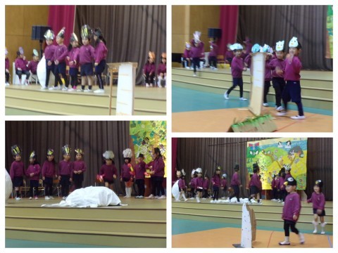 年長さんは、劇のナレーションや道具の出し入れも、自分たちで役割分担をしてやりきりました。
