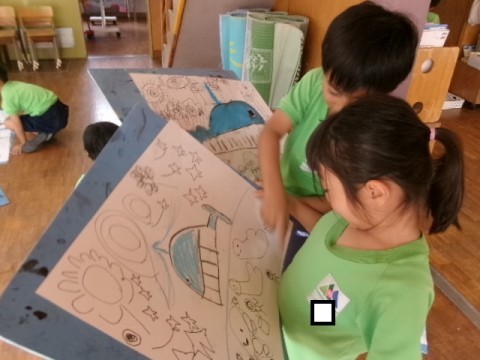 お話の絵の続きを描きました。初めて使うクーピーペンシルで思い思いに色を塗っていました。