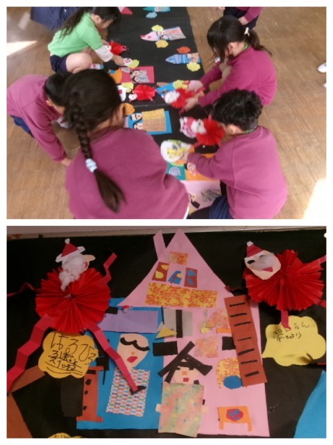 八上小学校では、1年1組さんと一緒にクリスマスカードづくりをしました。