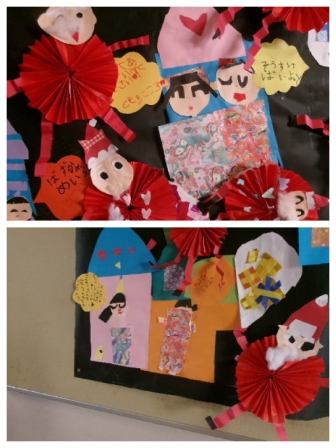 折り紙で服を折って,顔や手足は画用紙でつくりました☆
