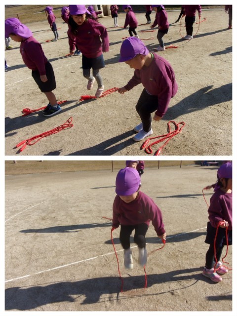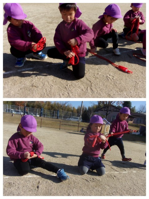まずは縄で遊びました。飛び越えたり回したりと縄でいろいろなことができることを知りましたよ。