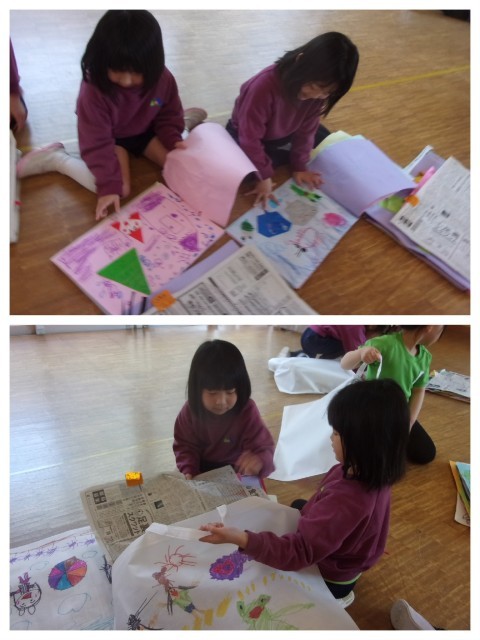 ぶどう組で描いた絵画や作品の整理をして、先日絵を描いた手提げ袋の中に入れて持ち帰りの準備をしました。