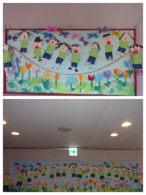 立体のチューリップやじゃばら折りのチョウチョもいて、にぎやかな壁面になりました♪