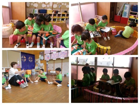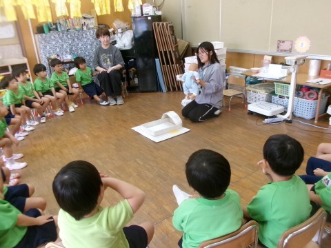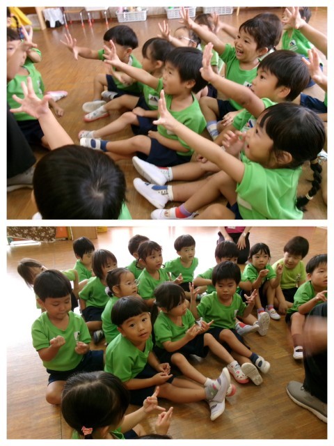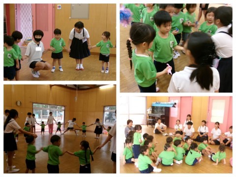 帰る前には実習生の先生が遊びに来てくれました。ミャクミャクのダンスを見てもらって満足げな子どもたちでした。