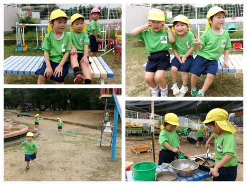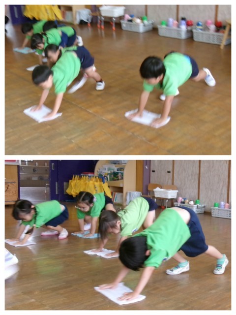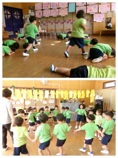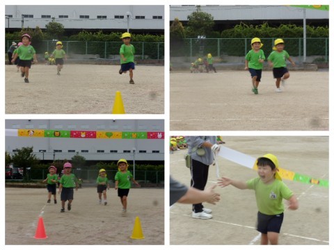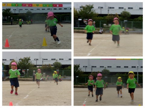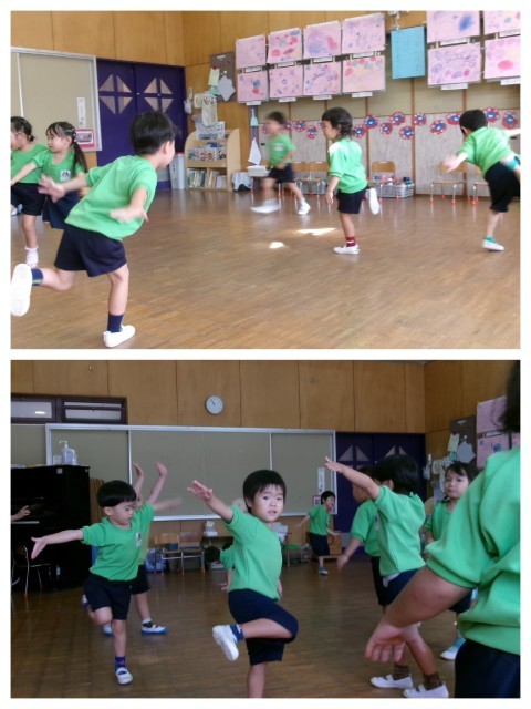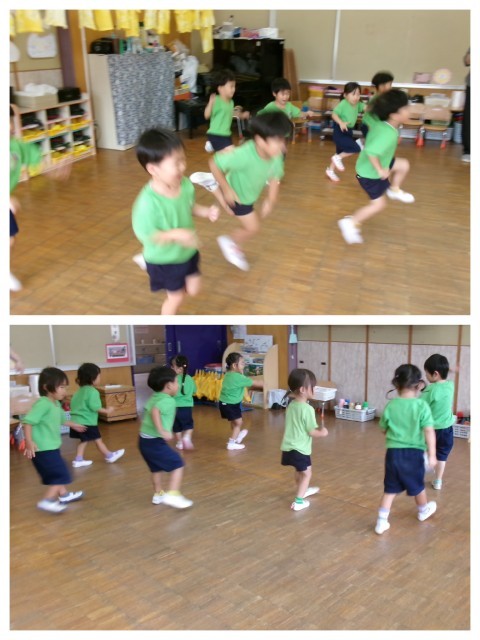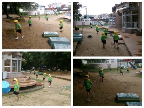 朝は運動場で大地っこ体操をしたり,きりん組さんとかけっこをしたりして楽しみました。