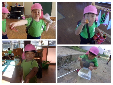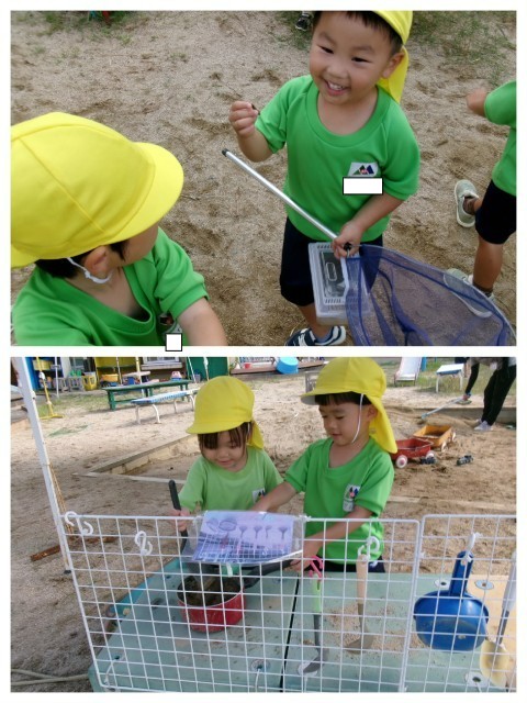 戸外では、ぶどう組の友達に虫の捕まえ方を教えてもらう姿もありました。