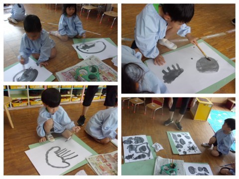 部屋では1学期でたくさん遊んだダンゴムシの絵を描きました。足がたくさん生えていたり,丸まっていたり,いろいろな様子のダンゴムシをイメージして描いています。