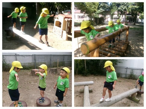 ケンケンパをしたり,鉄棒にぶら下がったりして元気いっぱい楽しんでいます。