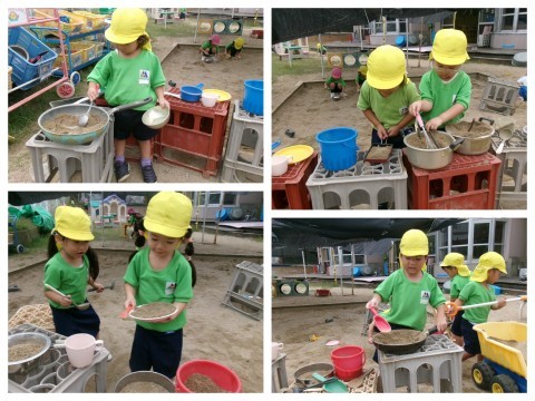 砂場では協力して深い穴を掘ることも楽しんでいます。
