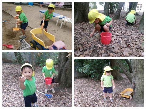 葉っぱやダンゴムシ、木の実を拾って嬉しそうに見せてくれます♪
