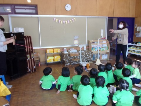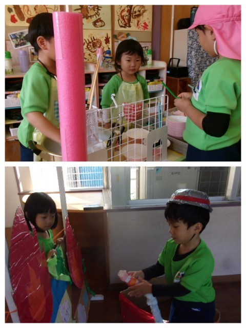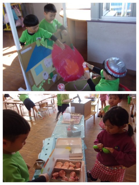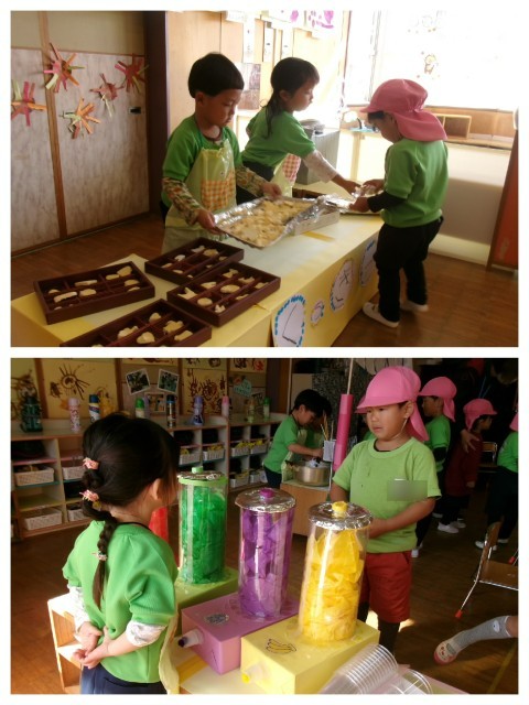 今日はきりん組,うさぎ組で一緒にお店屋さんごっこをしました。