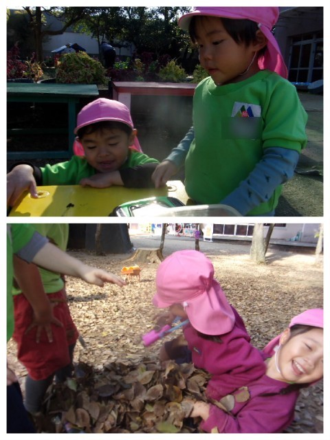 戸外ではたくさんある落ち葉を使って遊ぶのが大好きな子どもたち。
