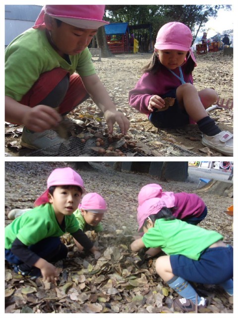 戸外ではどんぐりや葉っぱを集めることを楽しんでいる子どもたち。