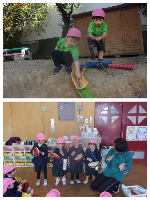 今日も戸外でいろいろな遊びを楽しみました。どんぐりを繰り返し転がしたり,友達とごっこ遊びをしながら遊んだりして楽しんでいます。