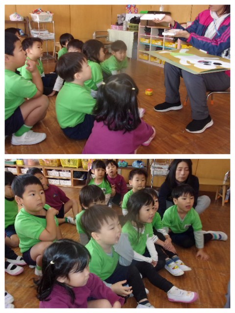 今日は楽器や歌で遊んだ後,『しろくまのパンツ』の絵本を読んでもらい,絵を描きました。