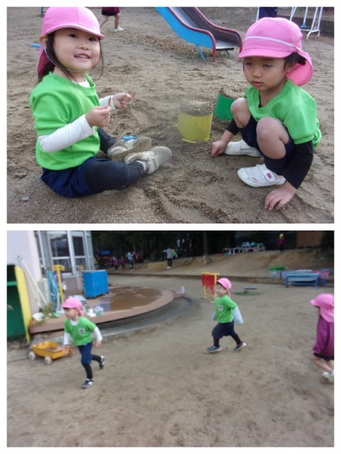 午後に遊びに出たときに、おもちゃの熊手で葉っぱを集めて「お掃除~」と楽しんでいた子どもたち。