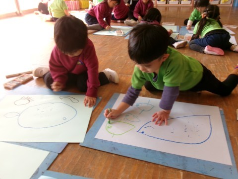 今日は楽器や歌で遊んだ後,『しろくまのパンツ』の絵本を読んでもらい,絵を描きました。