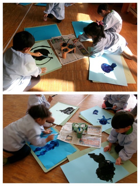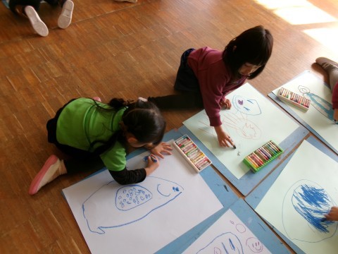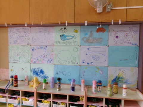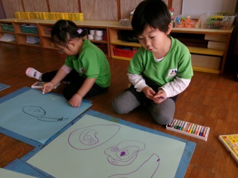 金曜日の海遊館への遠足を思い出して,ペンギンの絵を描きました。歩いているところ,泳いでいるところなど絵本も思い出しながら,思い思いに顔や体をかき進めています。