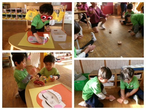 福笑いやコマ回し,絵合わせなど友達と一緒にすることが楽しくなってきています。