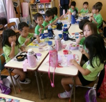 5歳児の子どもたちは公開保育があったため、3・4歳児の子どもたちでお弁当を食べました。