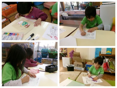 おやつの後は、塗り絵や物づくり、車やままごとなどいろいろな年齢の友達と楽しんでいました♪