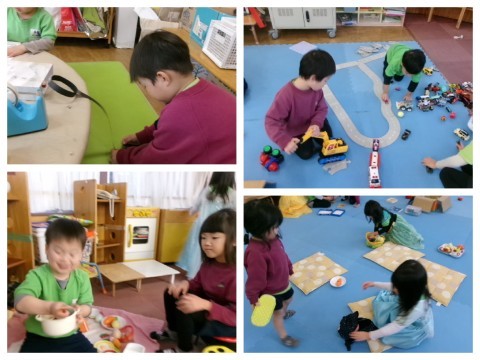 友だちとプラレールや道路を組み合わせて遊んだり、ボーリングをしたり、塗り絵やままごとをしたりして、好きな場所で好きな遊びを選んで過ごしました。