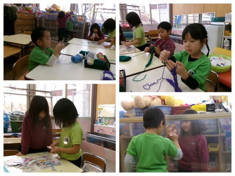 午睡中に4歳の子どもたちが毛糸で指あみに挑戦しました。