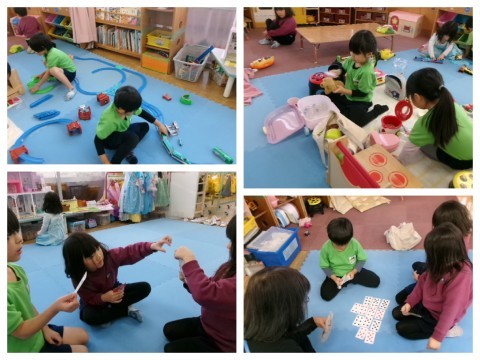 おやつの後は、トランプやレゴ、ままごとやプラレールなど友達と好きな遊びを楽しみました。
