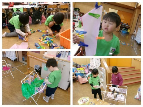 雑巾かけのラックをもってくると、綺麗に不織布をかけて、洗濯ばさみではさんで「洗濯ごっこ」が始まりました。