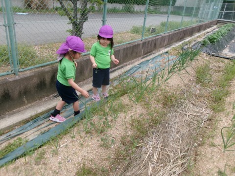外遊びでは、畑に紫色の花を咲かせた雑草が大きくなっていました。