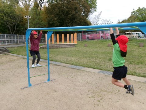 誘い合って転がしドッヂや鬼ごっこを楽しんだり、うんていにチャレンジしたりしていました。