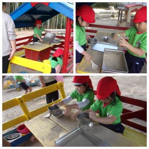 森のお家の中では、さら砂づくりをしている二人がいました。