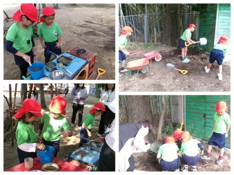森のキッチンで遊ぶ子どもたちは、なにやら、掘ったり、畑を作ったり、お料理したり…。