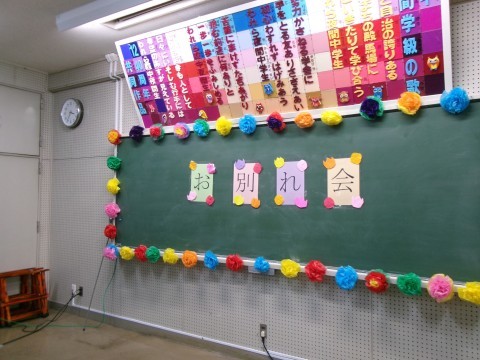 3がつ19にち(もくようび)2かいたもくてきしつで おわかれかいを おこないました。 「ざいこうせいから そつぎょうせいの びでおめっせーじ」や 「そつぎょうせいの すらいどじょうえい」、 ちゃんごの えんそうなどで そつぎょうせいと ざいこうせいが たがいに かんしゃの きもちを ふかめました。